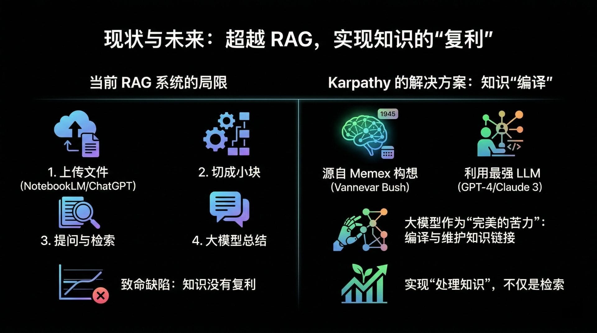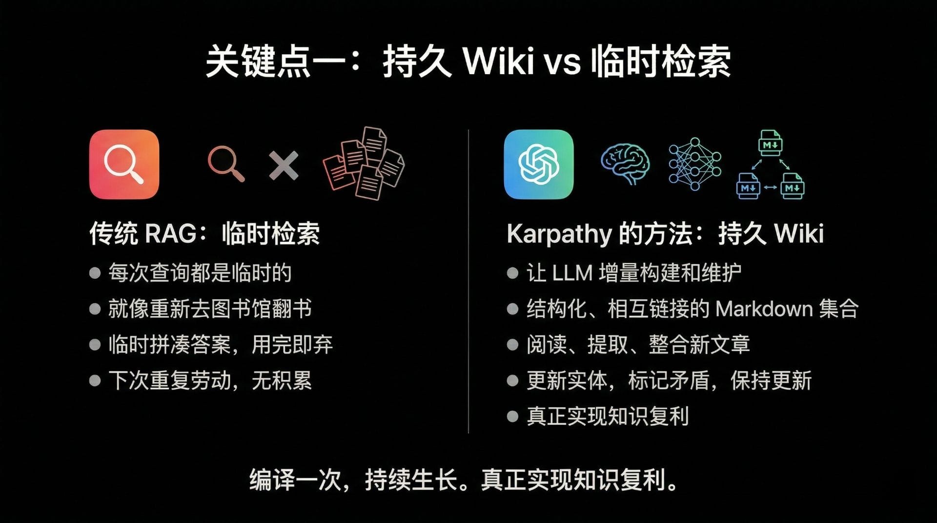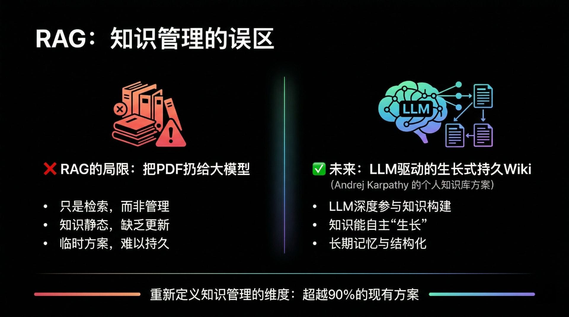传统 RAG 架构在解决大模型信息滞后问题上功不可没,但其在知识积累与深度整合上的结构性缺陷已日益凸显。Karpathy 提出的基于 LLM 的持久化 Wiki 架构,通过引入“知识编译”的概念和优雅的三层分离设计,为我们指明了下一代知识管理系统的演进方向。