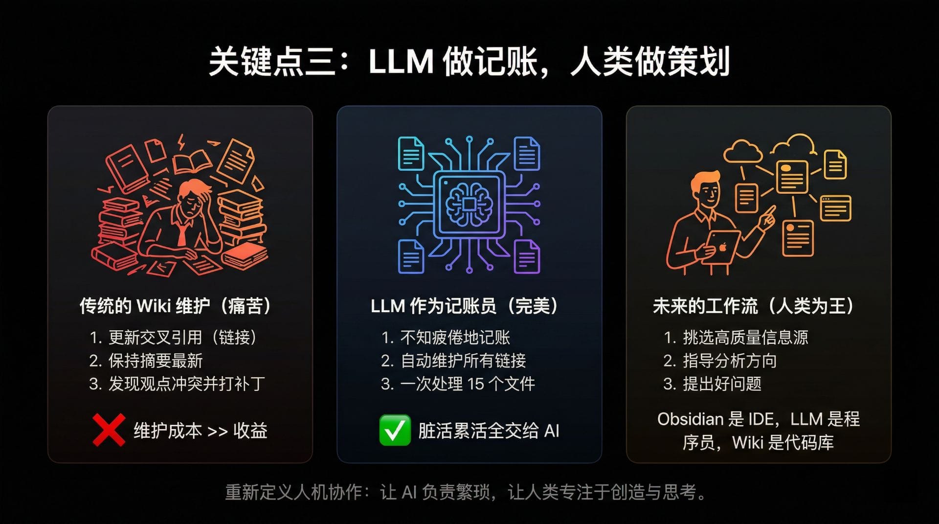 这种三层分离架构彻底改变了知识管理的范式。人类从繁琐的资料整理和链接维护中解放出来,转型为知识架构师,专注于挑选高质量的信息源和制定 Schema 规则;而 LLM 则发挥其不知疲倦、擅长处理海量文本的优势,承担起知识库“记账员”和“维护者”的角色。