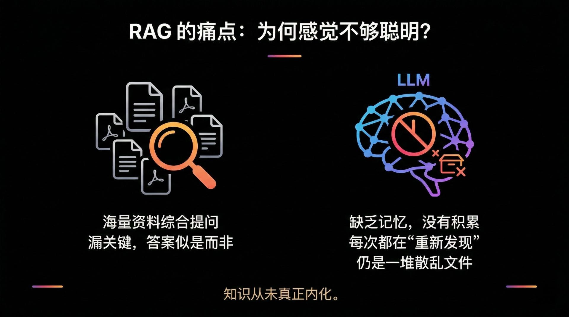 要理解 Karpathy 方案的颠覆性,首先需要剖析传统 RAG 架构在处理复杂知识管理时所暴露出的系统性缺陷。尽管 RAG 能够有效缓解大模型的幻觉问题并提供外部知识补充,但其在知识的长期积累与深度整合方面存在不可逾越的瓶颈。