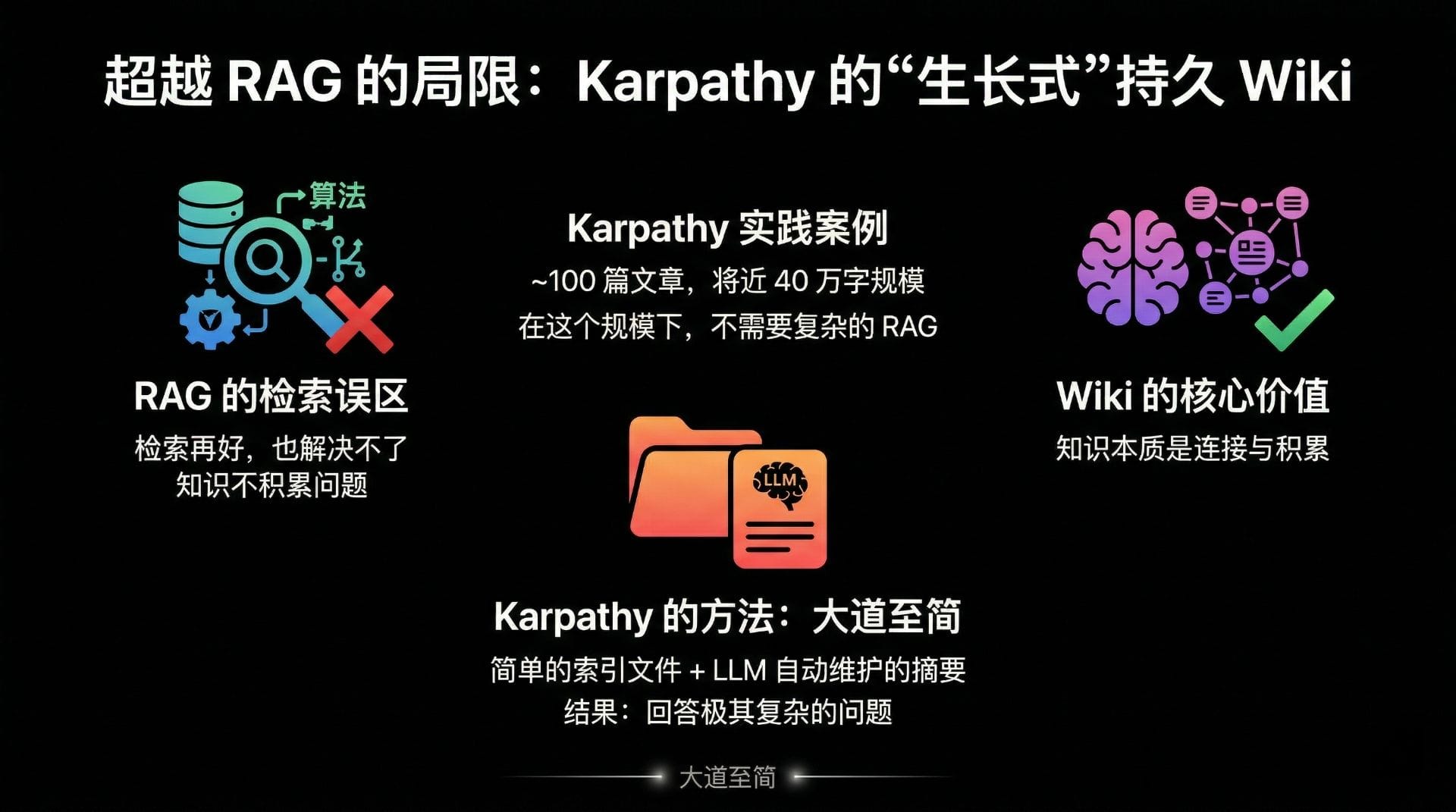 这种“大道至简”的实现方式揭示了一个深刻的道理:当知识已经被 LLM 深度编译并建立了高质量的内部链接后,检索的难度会大幅降低。复杂的 RAG 架构往往是在试图用算法弥补底层知识结构化的缺失。与其在检索端投入巨大成本,不如在知识摄入端通过 LLM 做好“编译”工作。先跑通基于轻量级索引的最小闭环,待知识规模真正突破物理瓶颈时,再考虑引入向量检索作为辅助手段,这才是更符合工程逻辑的演进路径。