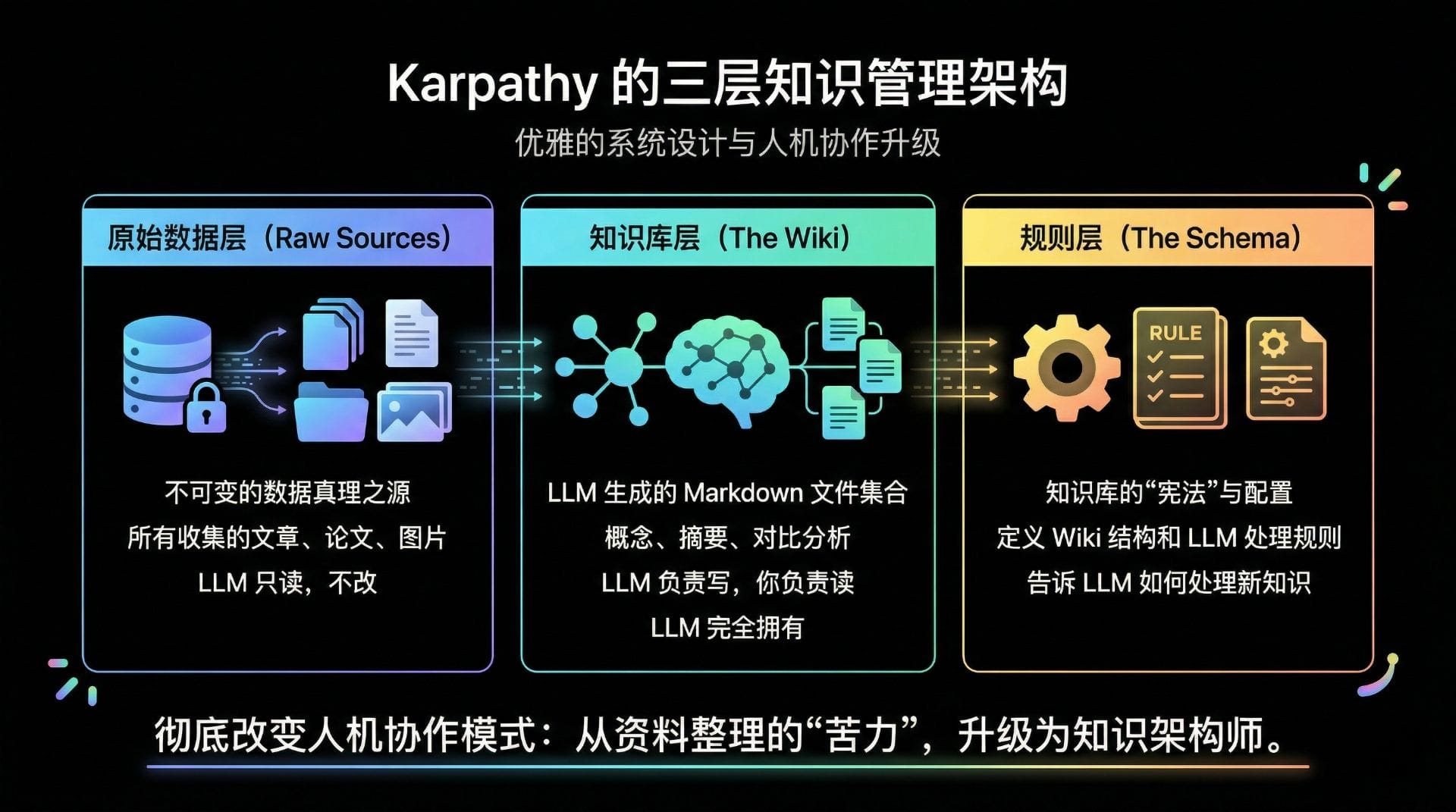 Karpathy 的 LLM 知识库之所以能够高效运转,得益于其极其严谨且优雅的三层架构设计。这种设计在软件工程中非常常见,但在知识管理领域的应用却展现出了惊人的威力,彻底厘清了人机协作的边界。